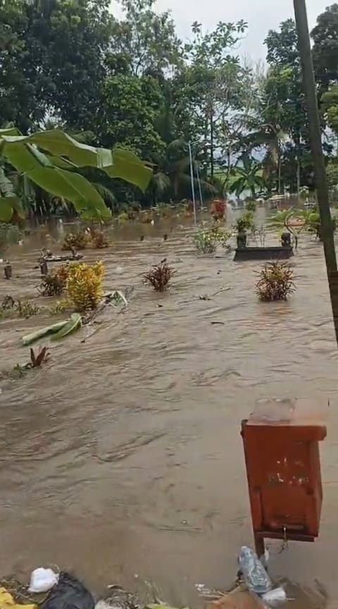 Banyuwangi, Kuasarakyat.com – Tempat Pemakaman Umum (TPU) di Desa Tegalsari, Kecamatan Tegalsari, Banyuwangi, terendam banjir akibat luapan Sungai Panduman, Selasa (17/02/26) sore. Genangan air bahkan mencapai setinggi batu nisan dan merendam sebagian area makam.