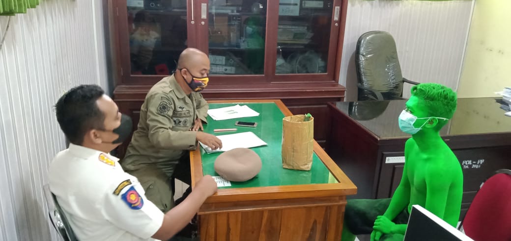 “Kami menertibkan orang yang mengecat sekujur tubuhnya dengan warna hijau di jl.Ahmad Yani tepatnya di Lampu merah Kantor Pengairan,” sebut Slamet.