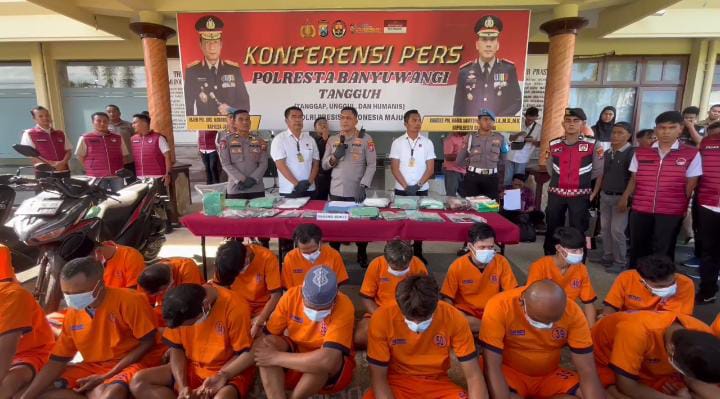 Banyuwangi, kuasarakyat.com – Satresnarkoba Polresta Banyuwangi berhasil mengungkap 16 kasus peredaran narkoba selama Mei 2025. Dari pengungkapan ini, polisi mengamankan 17 tersangka dengan total barang bukti sabu mencapai lebih dari 2 kilogram.