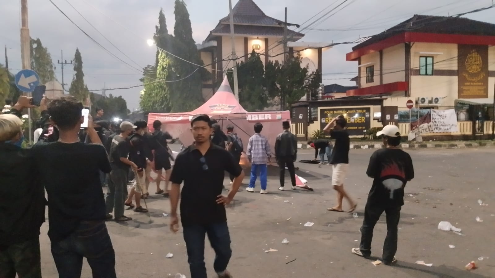 Tidak puas hanya melempar botol, beberapa peserta aksi semakin anarkhis, dengan memindahkan tenda pos Satlantas Polres Jember ke tengah jalan dan membakarnya.
