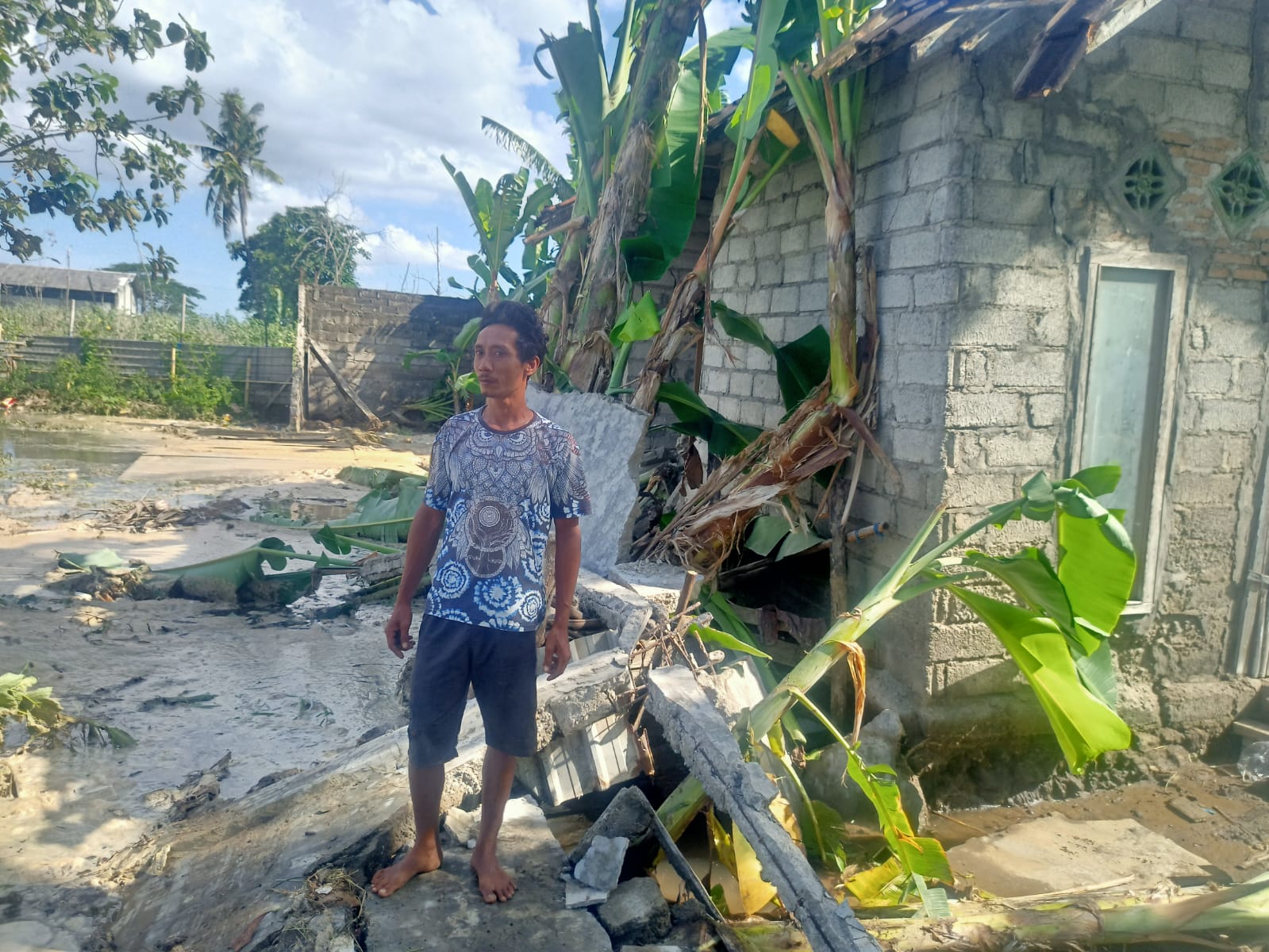 Ombak yang sampai menerjang tembok dan merobohkan rumah itu, terang dia, kemudian terus mengalir ke pemukiman warga. Jarak pemukiman dari pantai sekitar 200 meter.