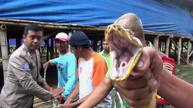 “Ular ini kami tangkap di bawah kandang setelah memangsa dua ekor ayam. Memang ular ini kami buru, karena sudah banyak makan ayam. Kira-kira lebih 20 ekor ayam dimakan ular ini,” kata Pengawas Kandang Ternak Ayam Abdul Kholik.