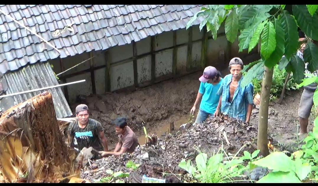 Beberapa warga dibantu aparat desa setempat hari ini membersihkan material longsoran yang menutupi bagian belakang rumah warga. Mereka membersihkan material longsoran dengan cara manual.