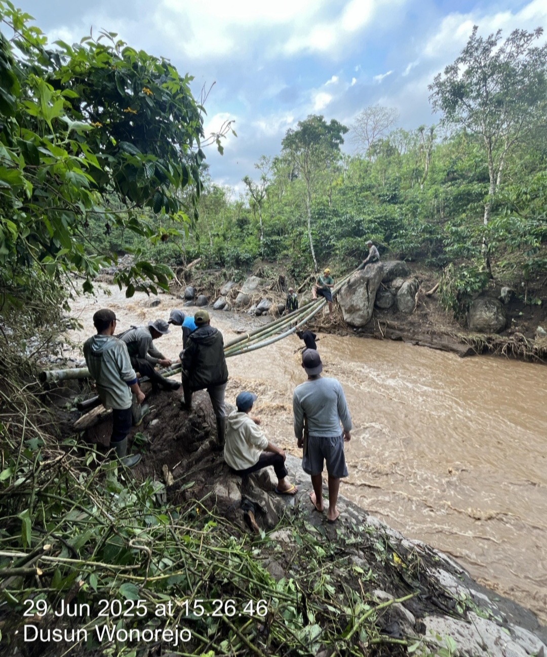 Selain saluran perpipaan, jembatan darurat bakal dibuat. Berbahan material kayu tumbang yang tersangkut di bibir Sungai Kalibaru kemudian dimanfaatkan untuk jembatan darurat.