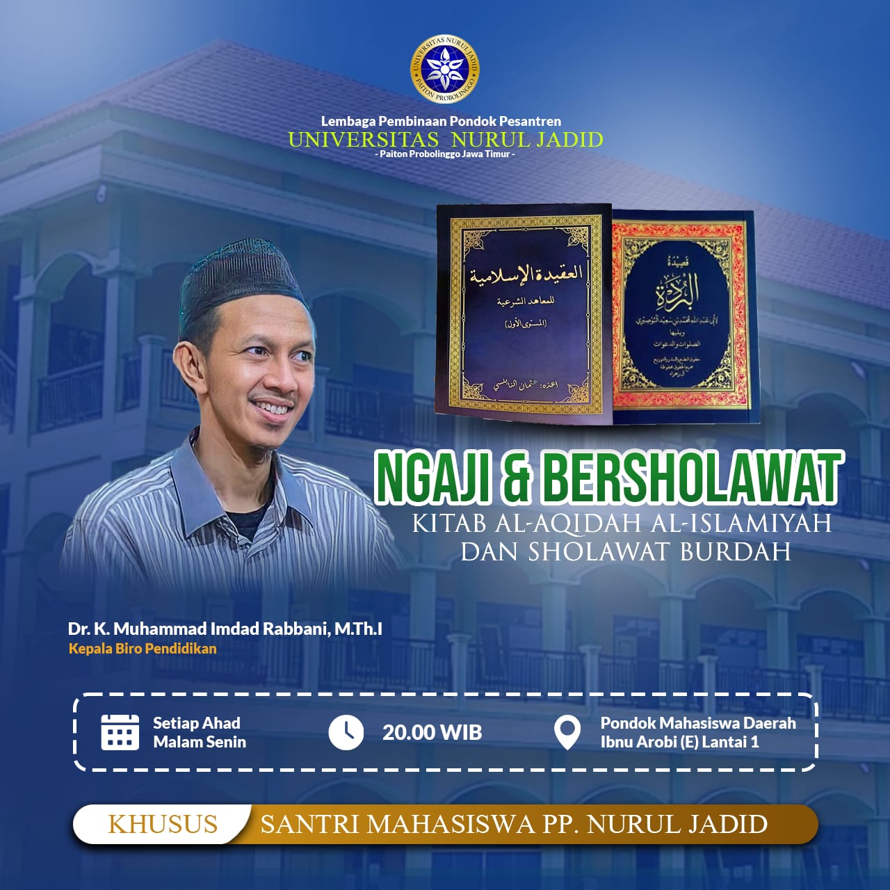 Di depan kamar asrama Pondok Mahasiwa Universitas Nurul Jadid, Paiton, Probolinggo tampak seperti mengheningkan cipta, Minggu (19/11/2023). Ngaji kitab Al-Aqidah Al-Islamiyah dan Solawat Burda dilaksanakan untuk pertama kalinya. Mahasiswa duduk bersila. Kitab, pensil dan buku catatan tak luput ia bawa. Mereka dengan khusuk menyaksikan video yang tampil dilayar proyektor.