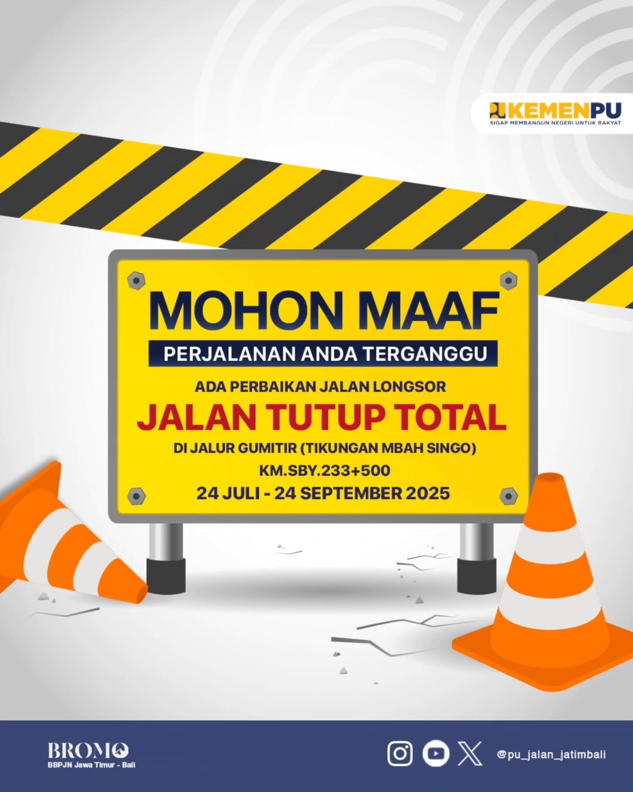 Jember, kuasarakyat.com – Jalur Gumitir yang menghubungkan Jember dengan Banyuwangi, mulai nanti Kamis (24/7/2025) pukul 00.00 WIB dinihari, resmi ditutup total untuk kendaraan roda 4 atau lebih, maupun untuk kendaraan roda 2 (R2) hingga 24 September mendatang.