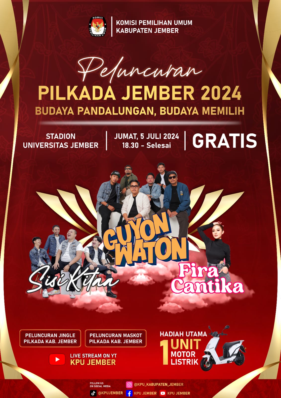 Jember, kuasarakyat.com – KPU Jember, akan melakukan Peluncuran Pilkada 2024 pada Jumat 5 Juli 2024, acara yang digelar di Stadion Universitas Negeri Jember ini, juga akan dimeriahkan oleh pagelaran Budaya Pandhalungan, serta Door Prize 1 unit motor listrik.