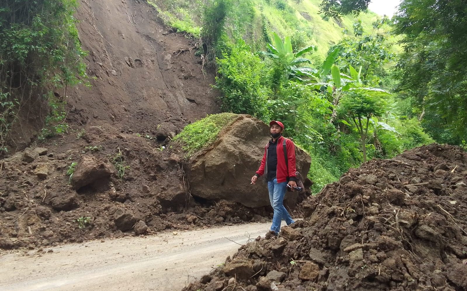 “Kalau longsor sering terjadi di sekitar sini, namun yang saat ini terjadi, tanah longsor menyebabkan gundukan batu besar jatuh ke badan jalan, dan menutup sebagian jalan yang ada,” tambah dia.
