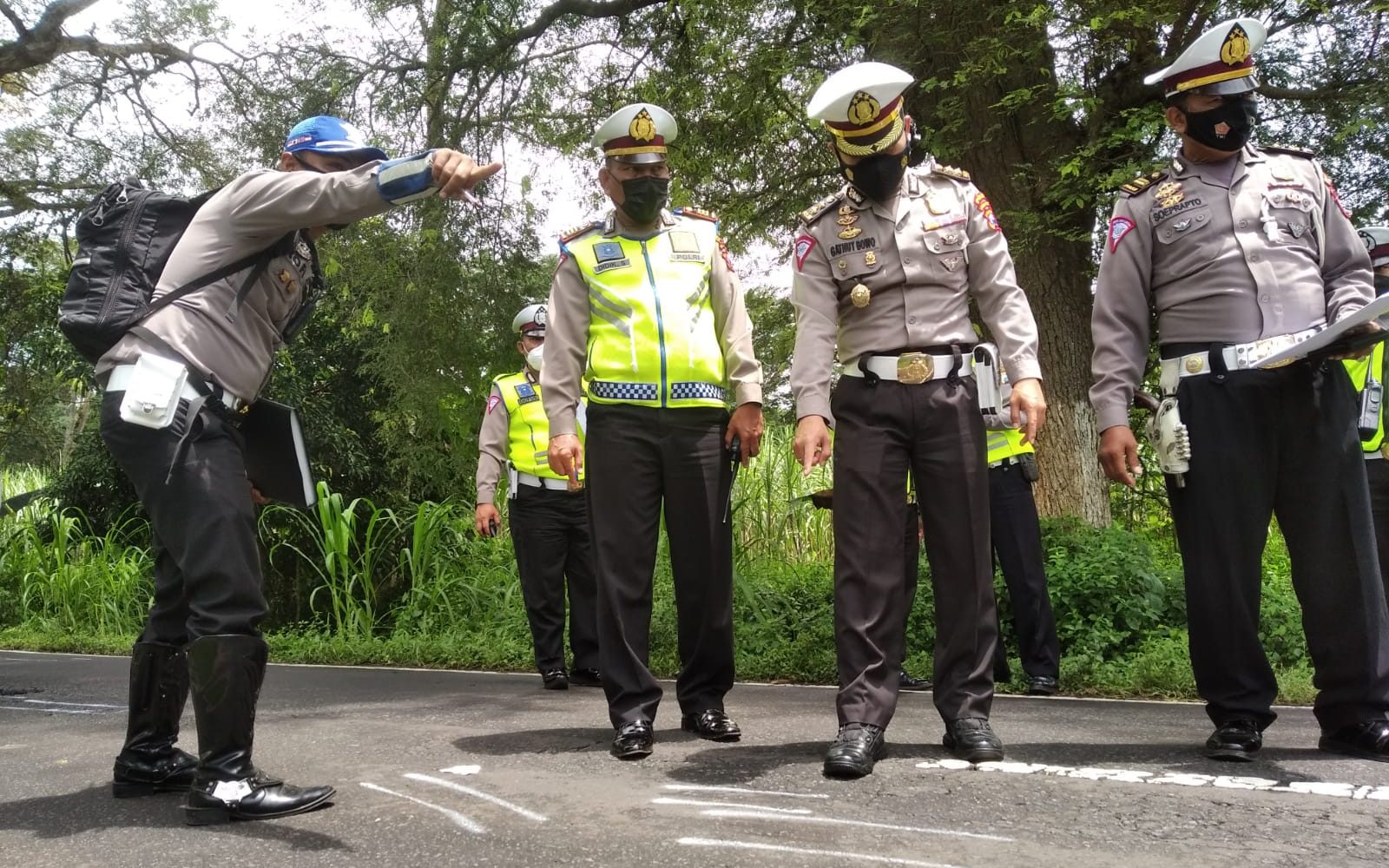 Proses olah TKP Ditlantas Polda Jatim di jalan raya Ijen, Desa Gunung Anyar, Kecamatan Tapen, Kabupaten Bondowoso.