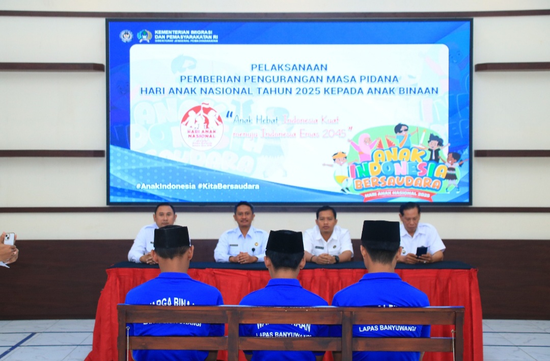 Banyuwangi, kuasarakyat.com – Tiga Anak Binaan di Lembaga Pemasyarakatan (Lapas) Kelas IIA Banyuwangi menerima Pengurangan Masa Pidana dari Kementerian Imigrasi dan Pemasyarakatan melalui Direktorat Jenderal Pemasyarakatan pada Hari Anak Nasional (HAN) 2025.