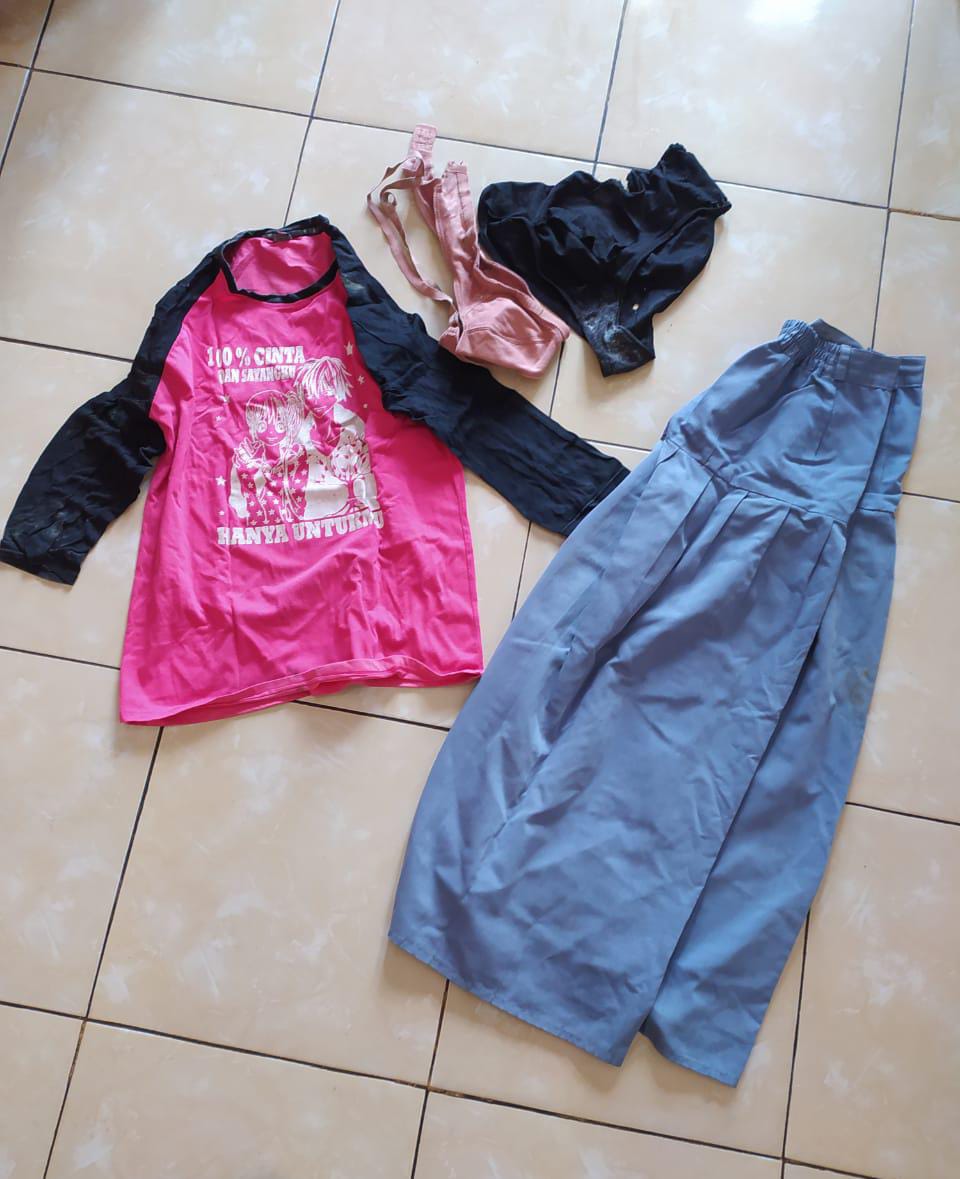 Adapun barang bukti di antaranya 1 potong kaos lengan panjang warna merah muda dan 1 potong rok panjang bahan kain warna abu-abu.